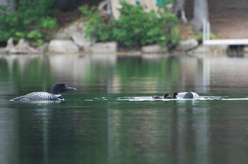 We at LPC are just as anxious as our Loon Cam viewers to keep tabs on this family throughout the rest of the season. In fact, determining the ultimate outcome of every loon territory in New Hampshire has been part of our mission for the last 43 years. But, truth be told, now that the chicks are hatched, the eggshell fragments collected, the ropes and signs hauled in and stored for next year and the paperwork brought up to date, this territory becomes a low priority for our regional field biologist. He needs to spend time on the lakes that have the loose ends; the ones with multiple loons that are playing a game of musical territories; the lakes where obstinate loons refuse to do a foot waggle (gotta get those band readings!); the lakes where the loons are acting strangely and might need a rescue.